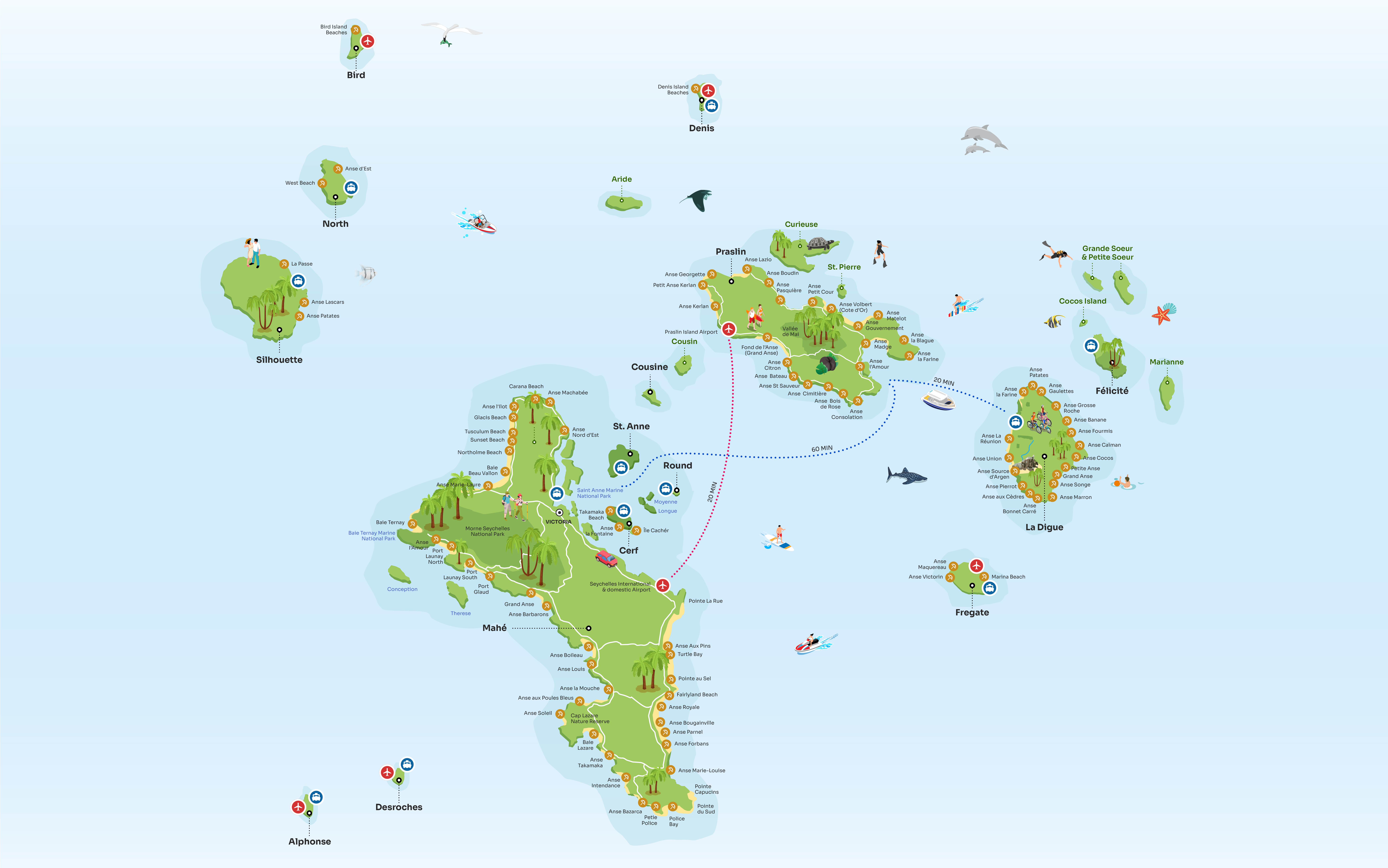 L'itinerario che abbiamo scelto si svolge intorno alle Inner Islands dell'arcipelago delle Seychelles, nel tratto di mare tra Mahé, l'isola più grande con una dimensione di 155 km², e le isole di Praslin, Silhouette e La Digue.